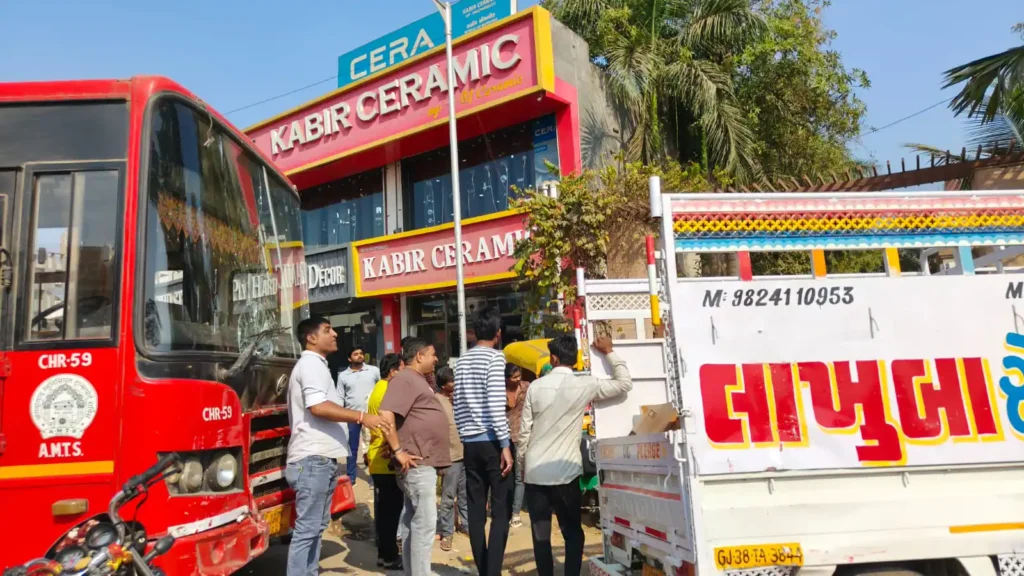 અમદાવાદ શહેરની ઓળખ ગણાતી લાલ બસ AMTS ફરી એકવાર અકસ્માતને કારણે વિવાદમાં આવી છે. શહેરના ગોતા સીરામીક માર્કેટ પાસે એક બેફામ ગતિએ આવતી AMTS બસે રોડ પર જઈ રહેલા એકસાથે ત્રણ વાહનોને જોરદાર ટક્કર મારી હતી. આ ટ્રિપલ અકસ્માતને પગલે સમગ્ર વિસ્તારમાં અફરાતફરીનો માહોલ સર્જાયો હતો.