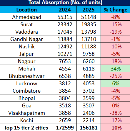 ૨૦૨૫માં દેશના ટોપના ૧૫ ટિયર-૨ શહેરોમાં નવા ઘરોના સપ્લાઈમાં ૬% ઘટાડો જોવા મળ્યો છે. આંકડા અનુસાર, ૨૦૨૪માં લોન્ચ થયેલા ૧૪૫,૧૩૯ યુનિટની સરખામણીમાં ૨૦૨૫માં ફક્ત ૧૩૬,૨૪૩ યુનિટ જ બજારમાં આવ્યા. આ ઘટાડો તમામ બજેટના ઘરોમાં નોંધાયો છે, જેમાં ૧ કરોડ રૂપિયાથી ઓછી કિંમતના ઘરોના સપ્લાઈમાં ૫% ઘટાડો અને ૧ કરોડ રૂપિયાથી વધુના પ્રીમિયમ ઘરોના સપ્લાઈમાં ૮% ઘટાડો થયો છે.