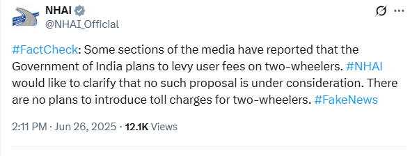 માર્ગ પરિવહન અને રાજમાર્ગ મંત્રાલયે એક નિવેદનમાં કહ્યું કે, ટોલ પ્લાઝા પર દ્વિચક્રી વાહનો પાસેથી ટોલ વસુલવા સંબંધિત સોશિયલ મીડિયા પર પ્રસારિત કરવામાં આવતી માહિતી ખોટી છે. NHAI સ્પષ્ટ કરવા ઈચ્છે છે કે, દેશભરના નેશનલ હાઇવે અને નેશનલ એક્સપ્રેસ વે પર સ્થિત ટોલ પ્લાઝા પર દ્વિચક્રી વાહનો પર કોઈ યુઝર ફી લેવામાં નથી આવતી. નેશનલ હાઇવે પર અને નેશનલ એક્સપ્રેસવે પર યુઝર ફી રાષ્ટ્રીય રાજમાર્ગ શુલ્ક નિયમ, ૨૦૦૮ હેઠળ વસુલવામાં આવે છે અને દ્વિચક્રી વાહનો પર ટોલ વસુલવાનો કોઈ પ્રસ્તાવ નથી.