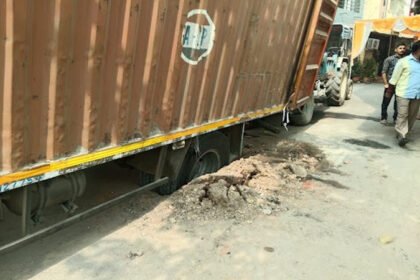 રાજમહેલના જાહેર રોડ પર જમીન બેસી જતા તોતિંગ ટ્રક ફસાઈ