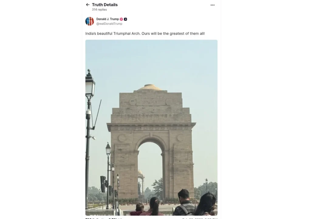 નવી દિલ્હીના ઇન્ડિયા ગેટના વખાણ કરતી ટ્રમ્પની એક પોસ્ટ