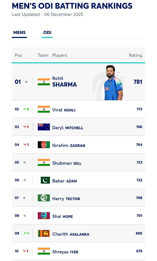 ICC ની તાજેતરની રેન્કિંગ સામે આવી છે, જેમાં ભારતીય ટીમના ક્રિકેટર્સનો જલવો જોવા મળ્યો છે. ૩૮ વર્ષીય રોહિત શર્માએ નંબર ૧ અને ૩૭ વર્ષીય વિરાટ કોહલીએ નંબર ૨ પર કબજો કર્યો છે. બીજી તરફ મિશેલ સ્ટાર્ક ટેસ્ટ ક્રિકેટમાં નંબર ૩ બોલર બની ગયો છે. એશિઝની બે શરૂઆતની ટેસ્ટમાં તેનું પ્રદર્શન શાનદાર રહ્યું છે. જસપ્રીત બુમરાહ નંબર ૧ ટેસ્ટ બોલર છે.