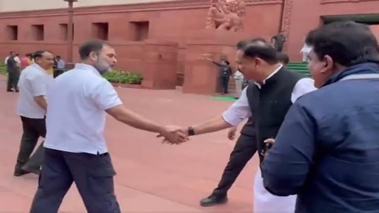 રાહુલના આ ‘અનકોમન હેન્ડશેક‘ એ સૌ કોઈનું ધ્યાન ખેંચ્યું છે. આ મુલાકાત તે સમયે થઈ, જ્યારે સદન ગૃહમાં બિહાર SIR તેમજ સંસદમાં મુખ્યમંત્રી-મંત્રીઓની ધરપકડ મુદ્દે રજૂ થનારા બિલનો વિપક્ષ વિરોધ કરી રહ્યો હતો. રાહુલ ગાંધીએ રાજીવ રૂડીને જોતાં જ તેમની પાસે જઈ હાથ મિલાવી અભિનંદન પાઠવ્યા હતા. બાદમાં પોતે જ મીડિયાને કહ્યું હતું કે, કોંગ્રેસ અને ભાજપ વચ્ચે એક અનકોમન હેન્ડશેક! અભિનંદન. જવાબમાં રૂડીએ સ્મિત સાથે આભાર માન્યો હતો.