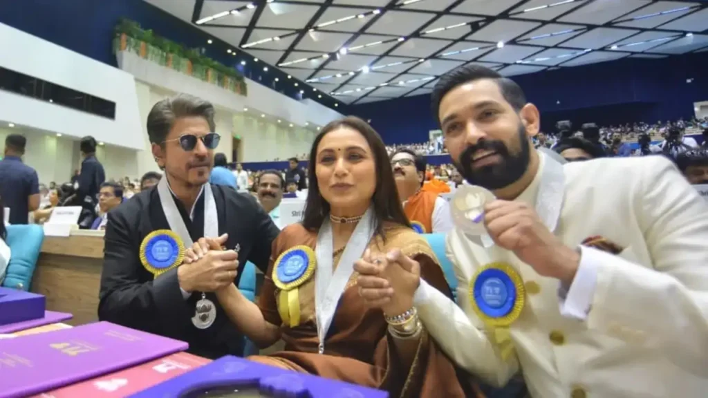 શાહરૂખ ખાન અને રાની મુખર્જી આ કાર્યક્રમમાં સાથે બેઠેલા જોવા મળ્યા હતા. શાહરૂખ ખાન બ્લેક લુકમાં હતા, જ્યારે રાની મુખર્જી બ્રાઉન રંગની સાડીમાં ચમકી હતી. વિક્રાંત મેસી પણ શાહરૂખ ખાન અને રાની સાથે બેઠેલા જોવા મળ્યા હતા. ઓફ-વ્હાઇટ સૂટમાં તેમની ડેશિંગ સ્ટાઇલે પણ ચાહકોના દિલ જીતી લીધા હતા. જણાવી દઈએ કે, શાહરૂખ ખાનને બેસ્ટ અભિનેતા અને રાની મુખર્જીને બેસ્ટ અભિનેત્રીનો પુરસ્કાર મળ્યો છે.